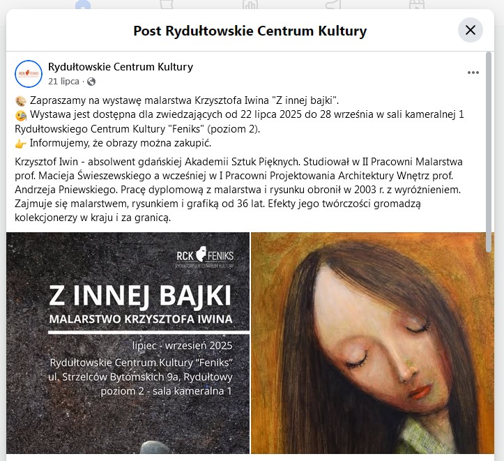 "Z innej bajki" Wystawa obrazów Krzysztofa Iwina. Zapraszamy na wystawę malarstwa Krzysztofa Iwina "Z innej bajki". Wystawa jest dostępna dla zwiedzających od 22 lipca 2025 do 28 września 2025.